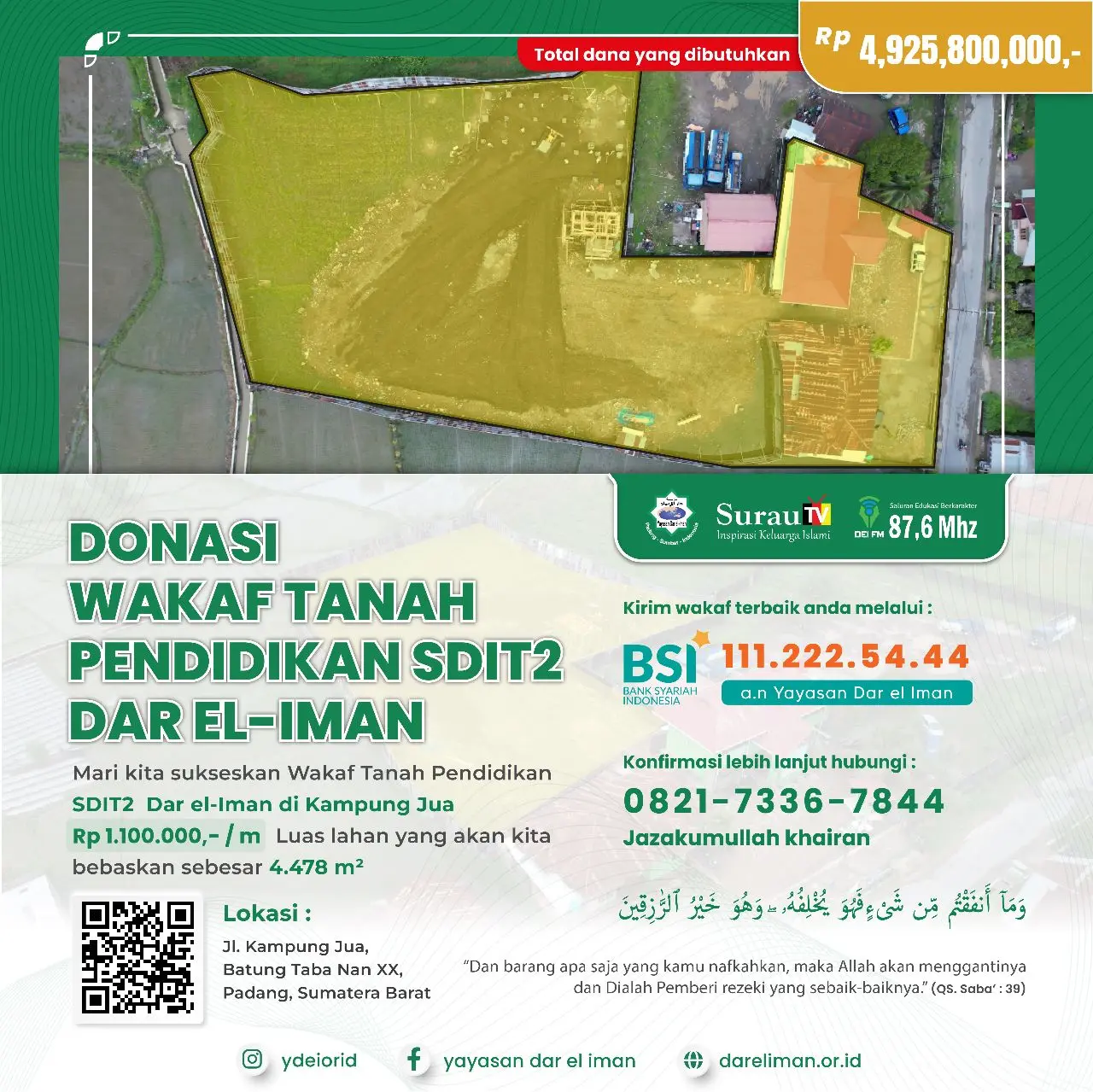 Yayasan Dar el-Iman Padang membuka peluang amal jariyah bagi kaum muslimin, yakni *Pembebasan Wakaf Tanah Pendidikan SDIT 2 Dar el-Iman Kampung Jua*. Dengan harga Rp 1.100.000,- /m.