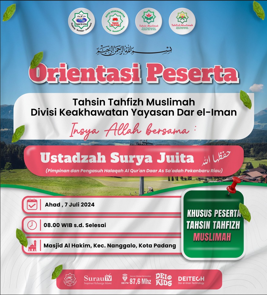 Diinfokan kepada seluruh peserta (peserta baru dan peserta yang masih aktif) Tahsin Tahfizh Muslimah Divisi Keakhawatan Yayasan Dar el-Iman, untuk dapat hadir mengikuti kegiatan orientasi yang insyaaAllah bersama :