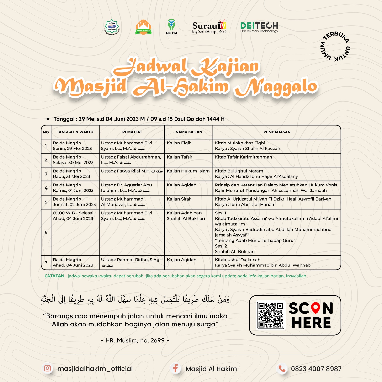 Note:Jadwal akan diperbarui ketika pergantian kitab atau pergantian pembahasan kajian.