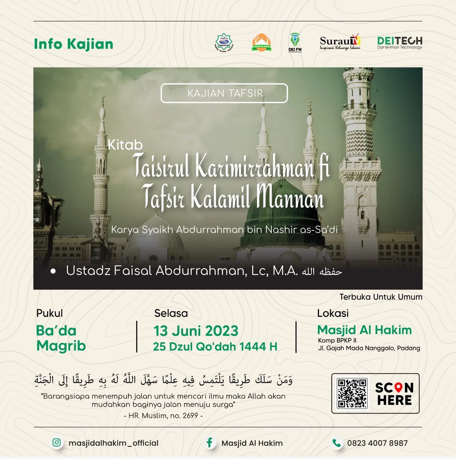 👤 Ustadz Faisal Abdurrahman, Lc, M.A. حفظه الله 📚 Syarah Kitab Tafsir Taisirul Karimirrahman fi Tafsir Kalamil Mannan 📆 Selasa 13 Juni 2023 ⏰ Ba’da Maghrib إِنْ شَاءَ اللَّهُ 🕌 Masjid Al Hakim Komp BPKP II, Jl. Gajah Mada, Nanggalo – Padang Maps : https://maps.app.goo.gl/9kL3h24Vq386c37N6