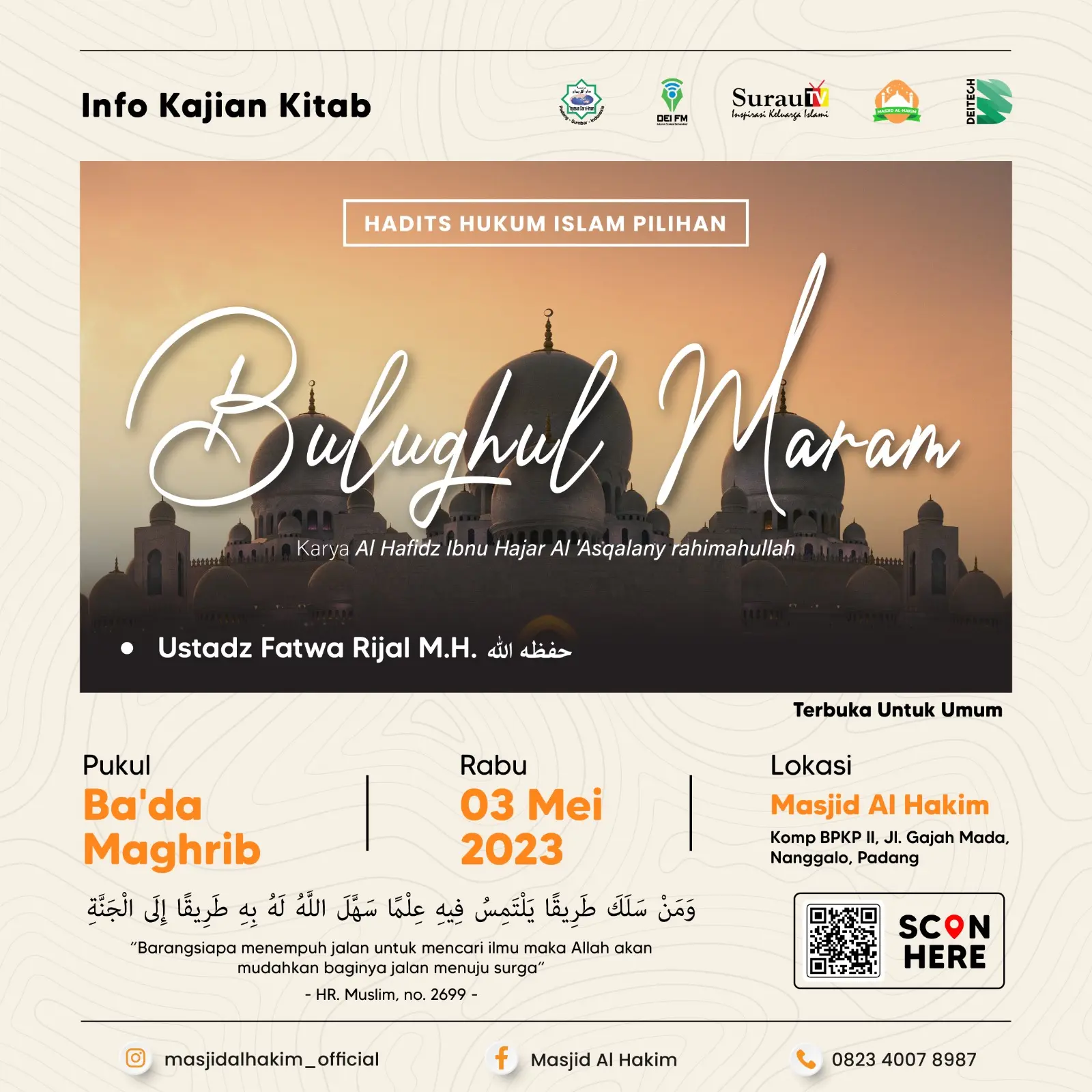 ๐ค Ustadz Fatwa Rijal M.H. ุญูุธู ุงููู ๐ Tema : Hadits Hukum Islam pilihan Kitab Rujukan : Bulughul Maram Karya : Al Hafidz Ibnu Hajar Al ‘Asqalany ุฑุญู ู ุงููู ๐ Rabu 03 Mei 2023 โฐ Ba’da Maghrib ุฅููู ุดูุงุกู ุงูููููู ๐ Masjid Al Hakim Komp BPKP II, Jl. Gajah Mada, Nanggalo – Padang Maps : https://maps.app.goo.gl/9kL3h24Vq386c37N6