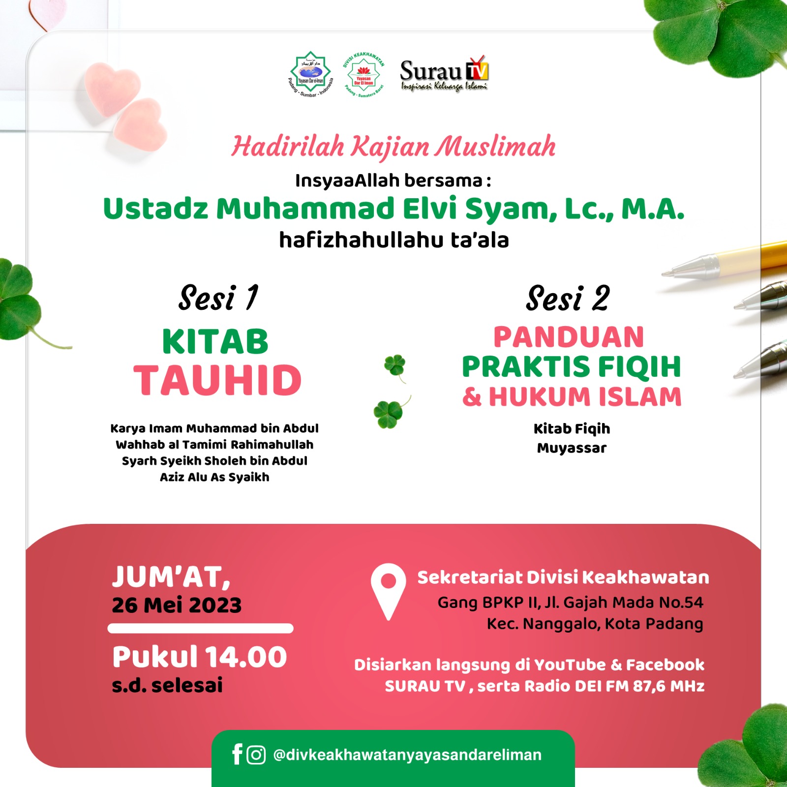 🗓️ Hari/Tanggal : Jum’at, 26 Mei 2023 🕑 Waktu : 14.00 WIB s.d. selesai 🏡 Tempat : Sekretariat Divisi Keakhawatan Gang Komp BPKP II, Jl. Gajah Mada No. 54, Kec. Nanggalo – Kota Padang