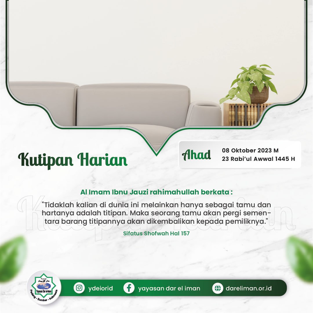 “Tidaklah kalian di dunia ini melainkan hanya sebagai tamu dan hartanya adalah titipan. Maka seorang tamu akan pergi sementara barang titipannya akan dikembalikan kepada pemiliknya.”