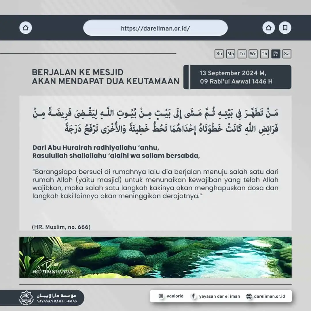 โBarangsiapa bersuci di rumahnya lalu dia berjalan menuju salah satu dari rumah Allah (yaitu masjid) untuk menunaikan kewajiban yang telah Allah wajibkan, maka salah satu langkah kakinya akan menghapuskan dosa dan langkah kaki lainnya akan meninggikan derajatnya.โ (HR. Muslim, no. 666)