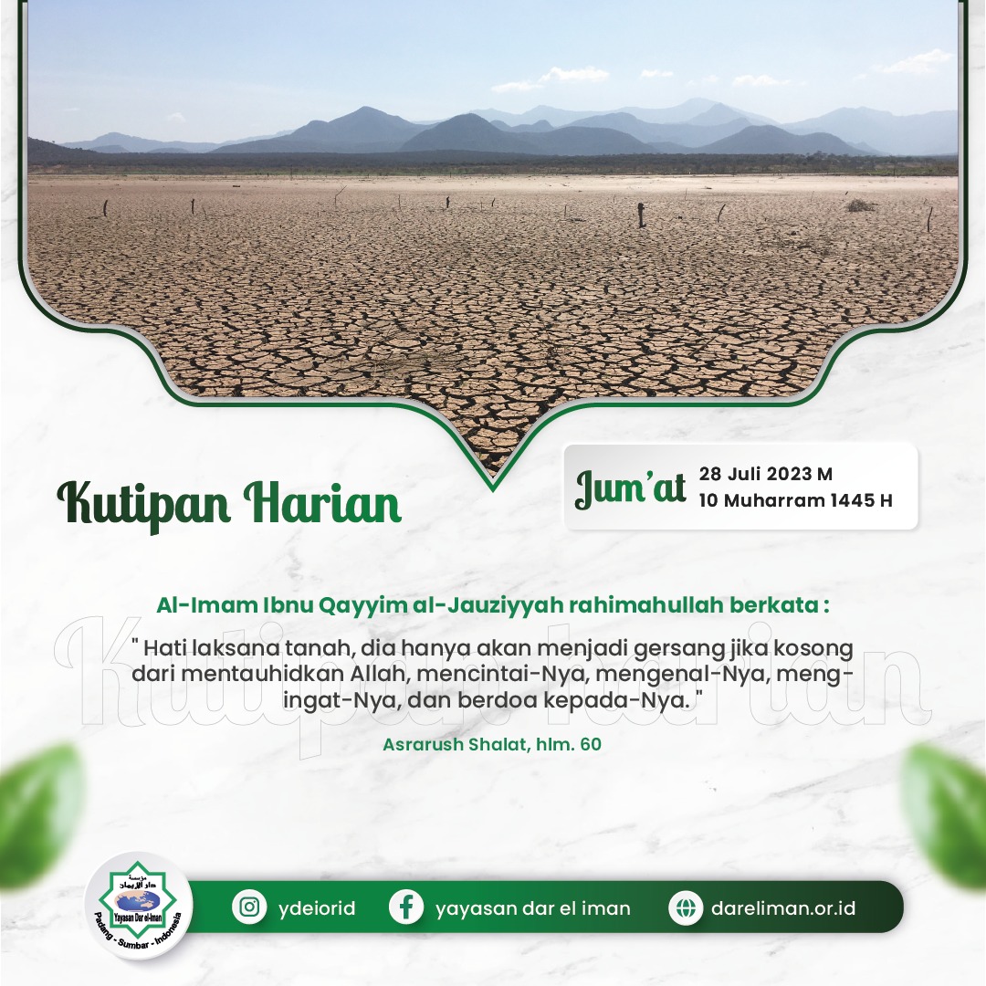“Hati laksana tanah, dia hanya akan menjadi gersang jika kosong dari mentauhidkan Allah, mencintai-Nya, mengenal-Nya, mengingat-Nya, dan berdoa kepada-Nya.”