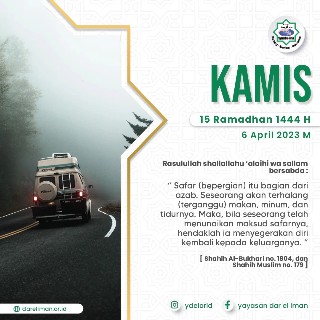 โSafar (bepergian) itu bagian dari azab. Seseorang akan terhalang (terganggu) makan, minum, dan tidurnya. Maka, bila seseorang telah menunaikan maksud safarnya, hendaklah ia menyegerakan diri kembali kepada keluarganya.โ