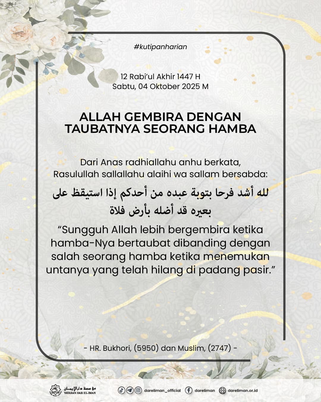 โSungguh Allah lebih bergembira ketika hamba-Nya bertaubat dibanding dengan salah seorang hamba ketika menemukan untanya yang telah hilang di padang pasir.โ