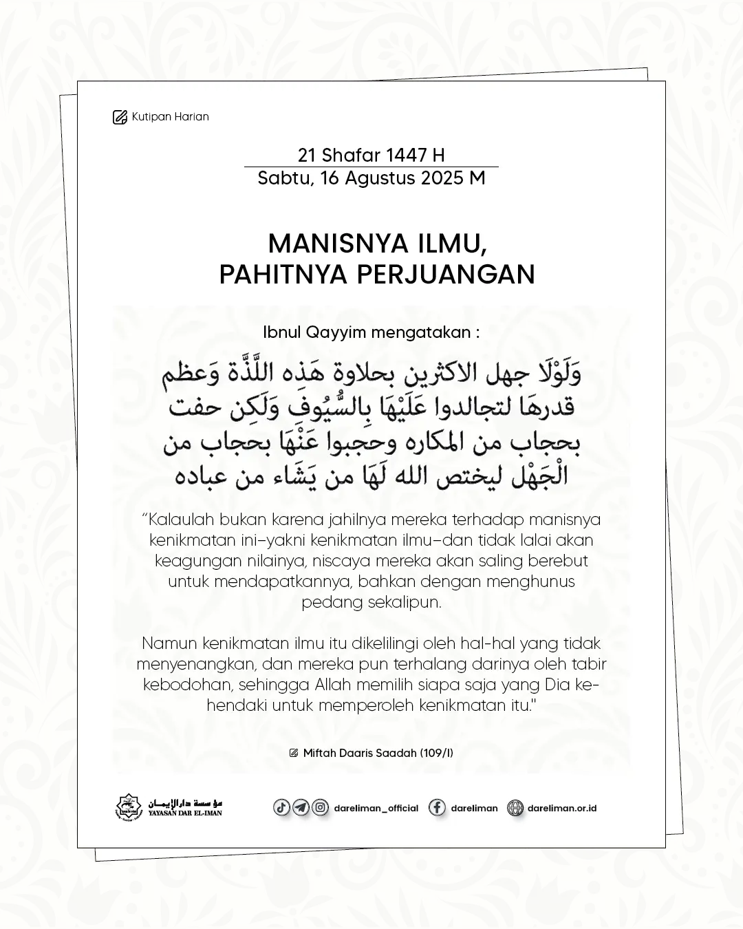 Namun kenikmatan ilmu itu dikelilingi oleh hal-hal yang tidak menyenangkan, dan mereka pun terhalang darinya oleh tabir kebodohan, sehingga Allah memilih siapa saja yang Dia kehendaki untuk memperoleh kenikmatan itu.”