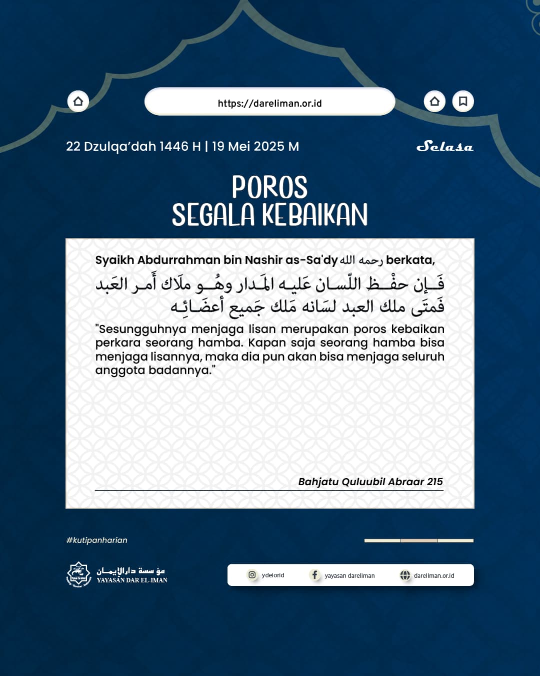 “Sesungguhnya menjaga lisan merupakan poros kebaikan perkara seorang hamba. Kapan saja seorang hamba bisa menjaga lisannya, maka dia pun akan bisa menjaga seluruh anggota badannya.”