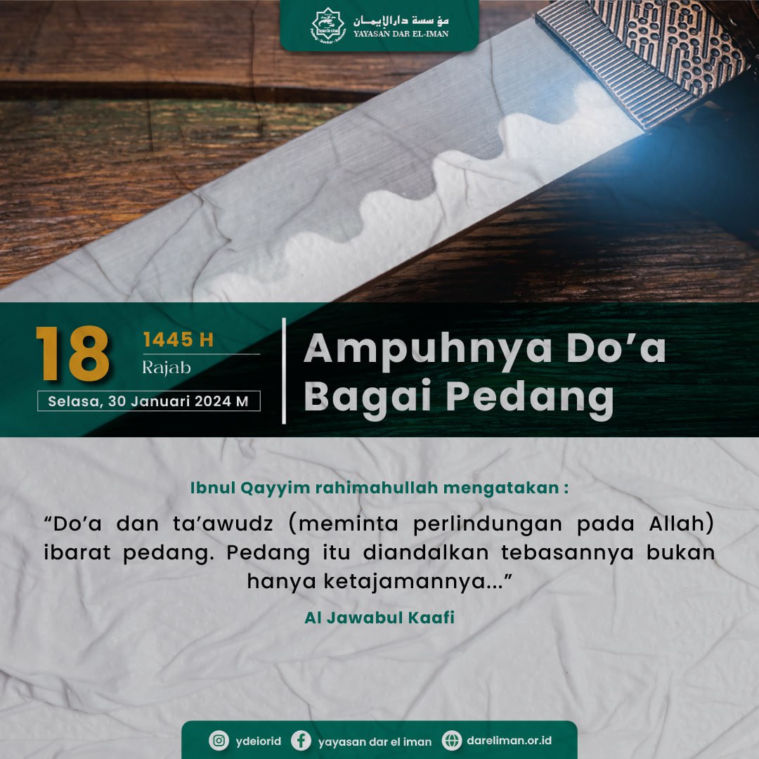 Ada ibarat yang sangat bagus yang disampaikan oleh Ibnu Qayyim Al Jauziyah. Beliau menyampaikan bagaimanakah ampuhnya doโ€™a dan ini diibaratkan seperti tajamnya pedang. Kita harus merenungkan hal ini agar kita dapat semangat terus untuk berdoโ€™a dan tidak berputus asa.