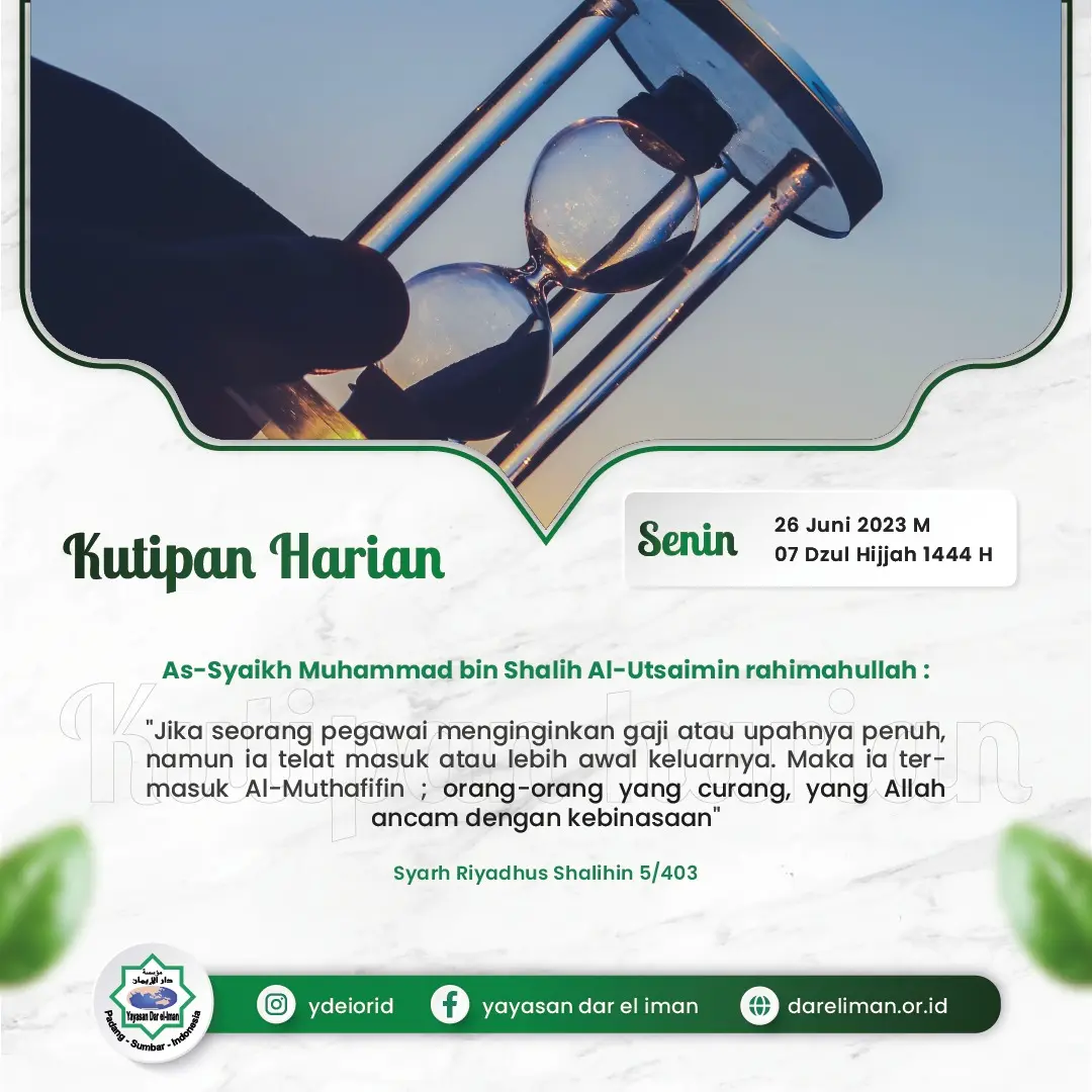 โ€œJika seorang pegawai menginginkan gaji atau upahnya penuh, namun ia telat masuk atau lebih awal keluarnya. Maka ia termasuk Al-Muthafifin ; orang-orang yang curang yang Allah ancam dengan kebinasaan.โ€