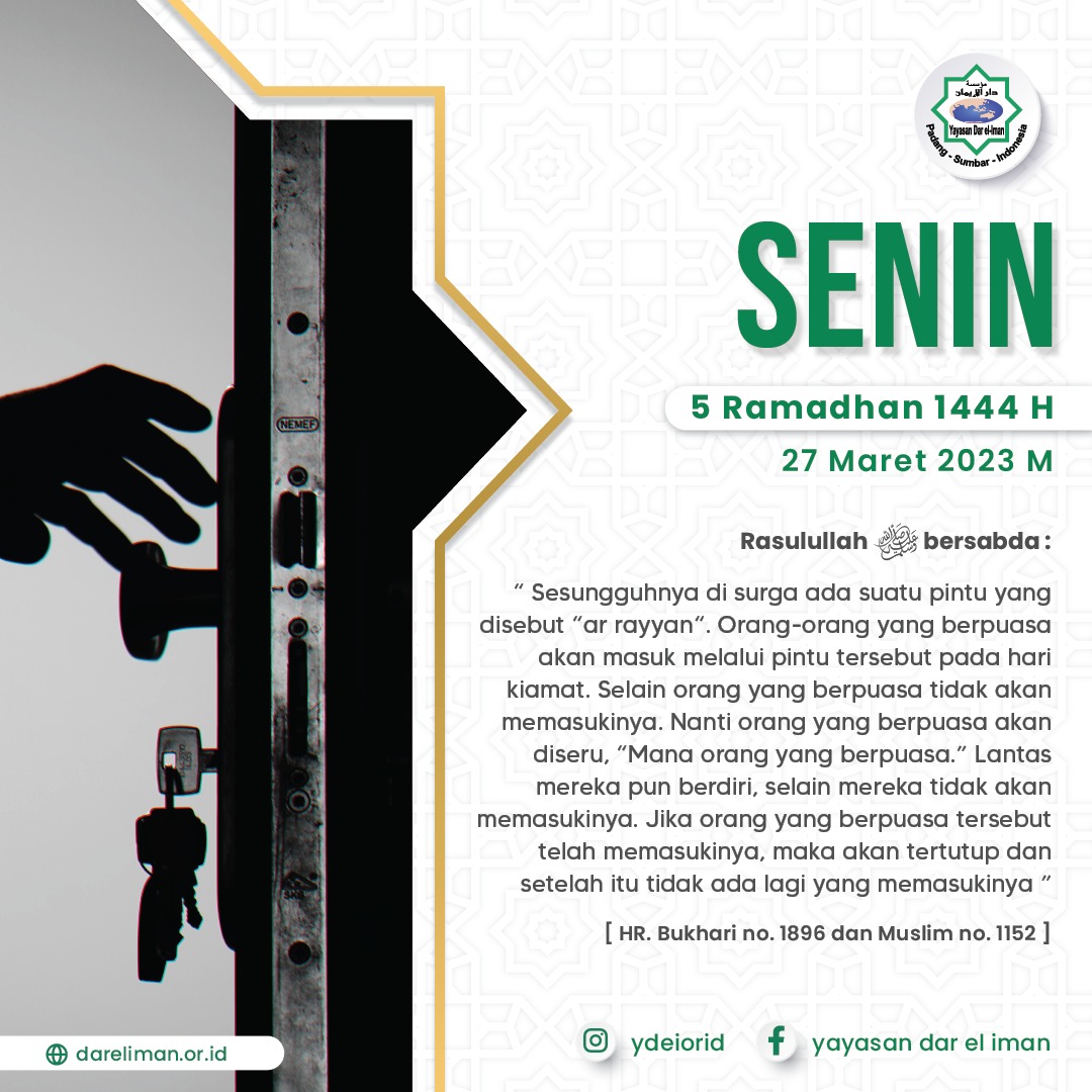 โ Sesungguhnya di surga ada suatu pintu yang disebut โar rayyanโ. Orang-orang yang berpuasa akan masuk melalui pintu tersebut pada hari kiamat. Selain orang yang berpuasa tidak akan memasukinya. Nanti orang yang berpuasa akan diseru, โMana orang yang berpuasa.โ Lantas mereka pun berdiri, selain mereka tidak akan memasukinya. Jika orang yang berpuasa tersebut telah memasukinya, maka akan tertutup dan setelah itu tidak ada lagi yang memasukinya. โ
