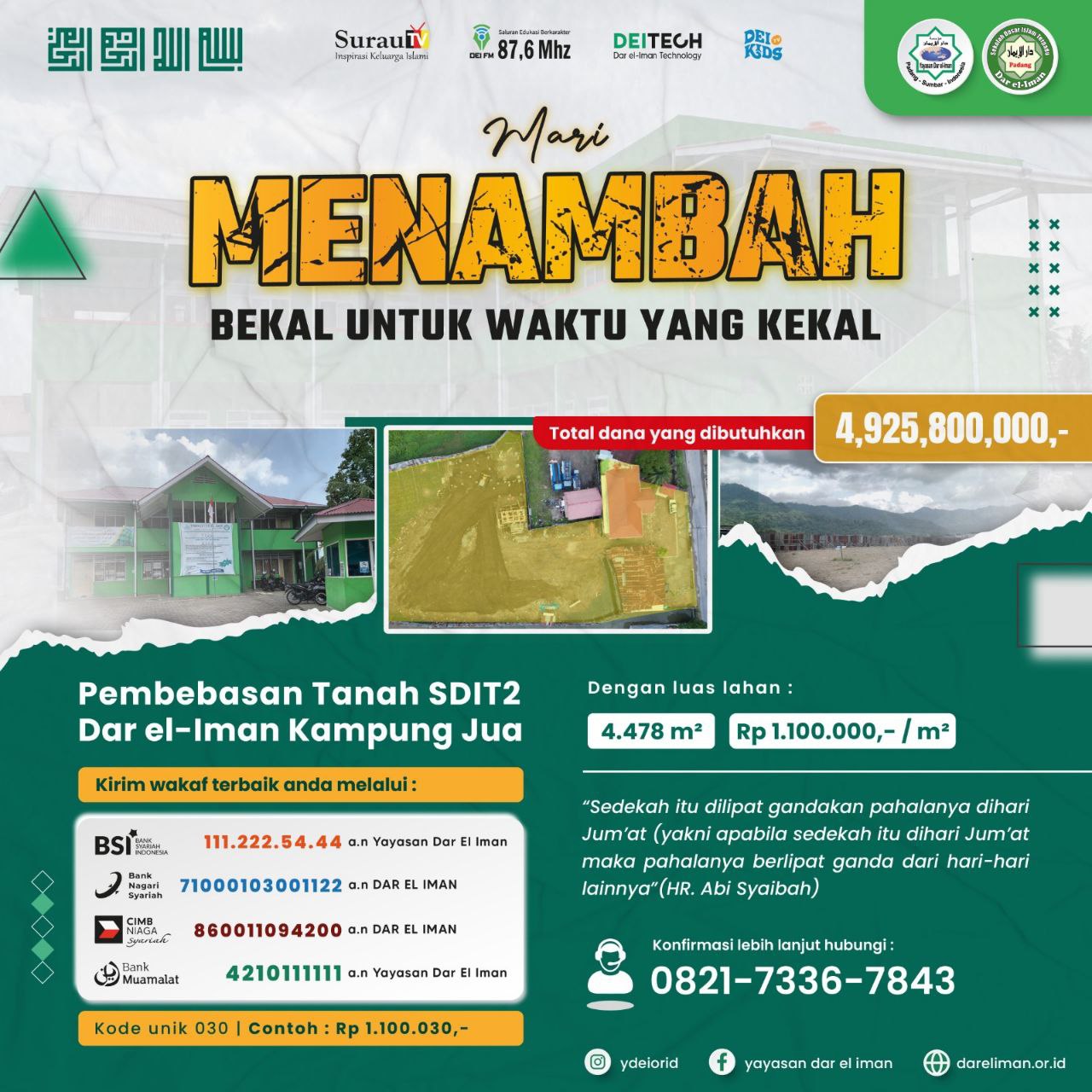 Yuk maksimalkan keberkahan hari ini, caranya dengan support Program Pembebasan Tanah Pendidikan SDIT2 Dar el-Iman Kampung Jua Rp 1.100.000,- /m²