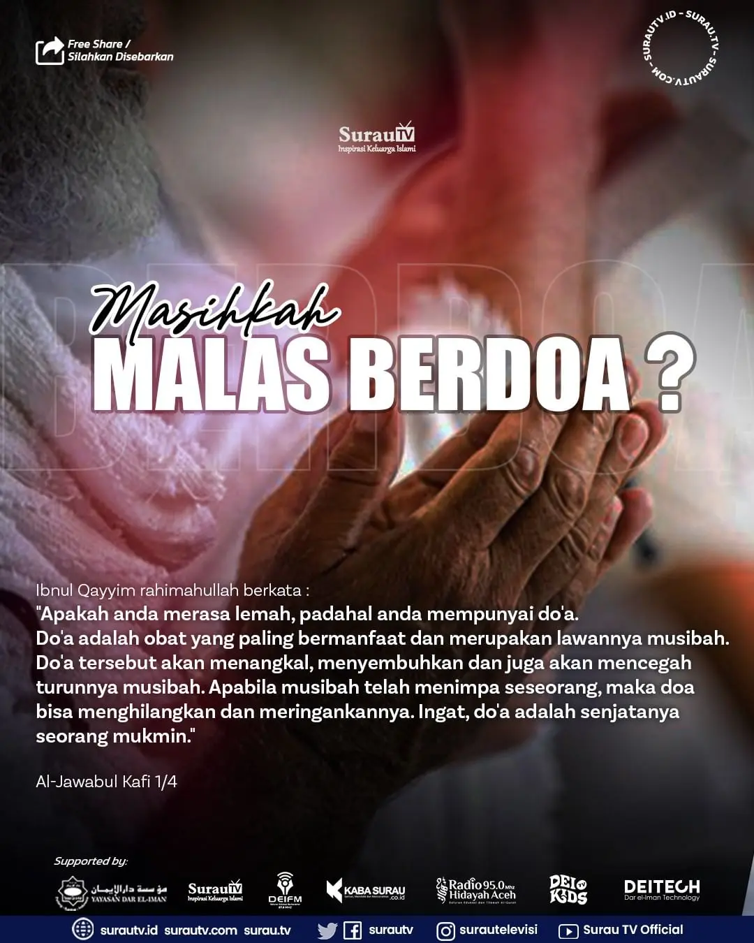 Apakah anda merasa lemah, padahal anda mempunyai do’a. Do’a adalah obat yang paling bermanfaat dan merupakan lawannya musibah. Do’a tersebut akan menangkal, menyembuhkan dan juga akan mencegah turunnya musibah. Apabila musibah telah menimpa seseorang, maka doa bisa menghilangkan dan meringankannya. Ingat, do’a adalah senjatanya seorang mukmin.