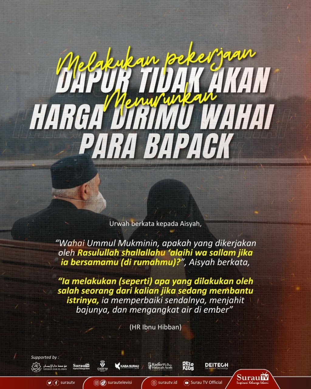 “Wahai Ummul Mukminin, apakah yang dikerjakan oleh Rasulullah shallallahu ‘alaihi wa sallam jika ia bersamamu (di rumahmu)?”, Aisyah berkata, “Ia melakukan (seperti) apa yang dilakukan oleh salah seorang dari kalian jika sedang membantu istrinya, ia memperbaiki sendalnya, menjahit bajunya, dan mengangkat air di ember”