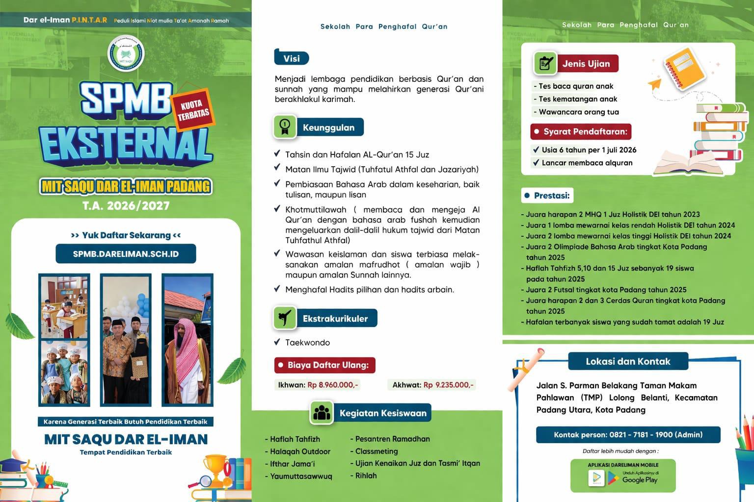 Informasi pendaftaran dapat diakses melalui laman resmi spmb.dareliman.sch.id atau menghubungi layanan admin yang tersedia. Kuota terbatas, pendaftaran dibuka dalam waktu tertentu.