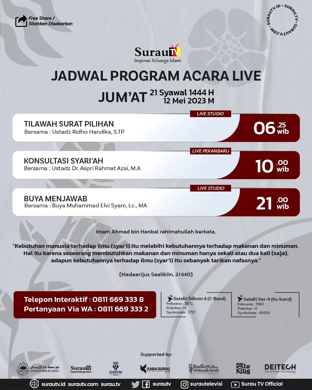 Jadwal Program Acara LIVE,Jum’at, 21 Syawal 1444 H / 12 Mei 2023📺 Saksikan di Surau TV :– Satelit Telkom 4 (C-Band), Frekuensi : 3872, Polaritas : H, Symbolrate : 2727– Satelit Ses-9 (Ku-band), Frekuensi : 11861, Polaritas : H, Symbolrate : 45000– Facebook dan Youtube Surau TV– LIVE Streaming : http://www.surau.tv– Via ARTVISI : https://live.artvisi.or.id/mobile/channel/surautv– Via Aplikasi : https://play.google.com/store/apps/details?id=com.app.surautvJangan lewatkan informasi terupdate Surau TV dengan bergabung di Grup WA dan Telegram :‼️ Join Grup WA Sahabat Surau TV Khusus Ikhwan :🛄https://chat.whatsapp.com/GVCDbXdoKD9HHiTqIOcSQK‼️ Join Grup WA Sahabat Surau TV Khusus Akhwat :🛄https://chat.whatsapp.com/GN43rGZGOR92FNxr5XFTQq📪 Join Telegram : https://t.me/surautv♻ Silahkan disebarkan kepada setiap orang yang kita kenal,Jazakumullahu khairan wa barakallahu fiikumSupported by:📺 Deikids TV🖥️ Kabasurau.co.id📻 Radio Hidayah Aceh📻 Radio DEI FM📡 Surau TV🌐 Yayasan Dar el-Iman Padang