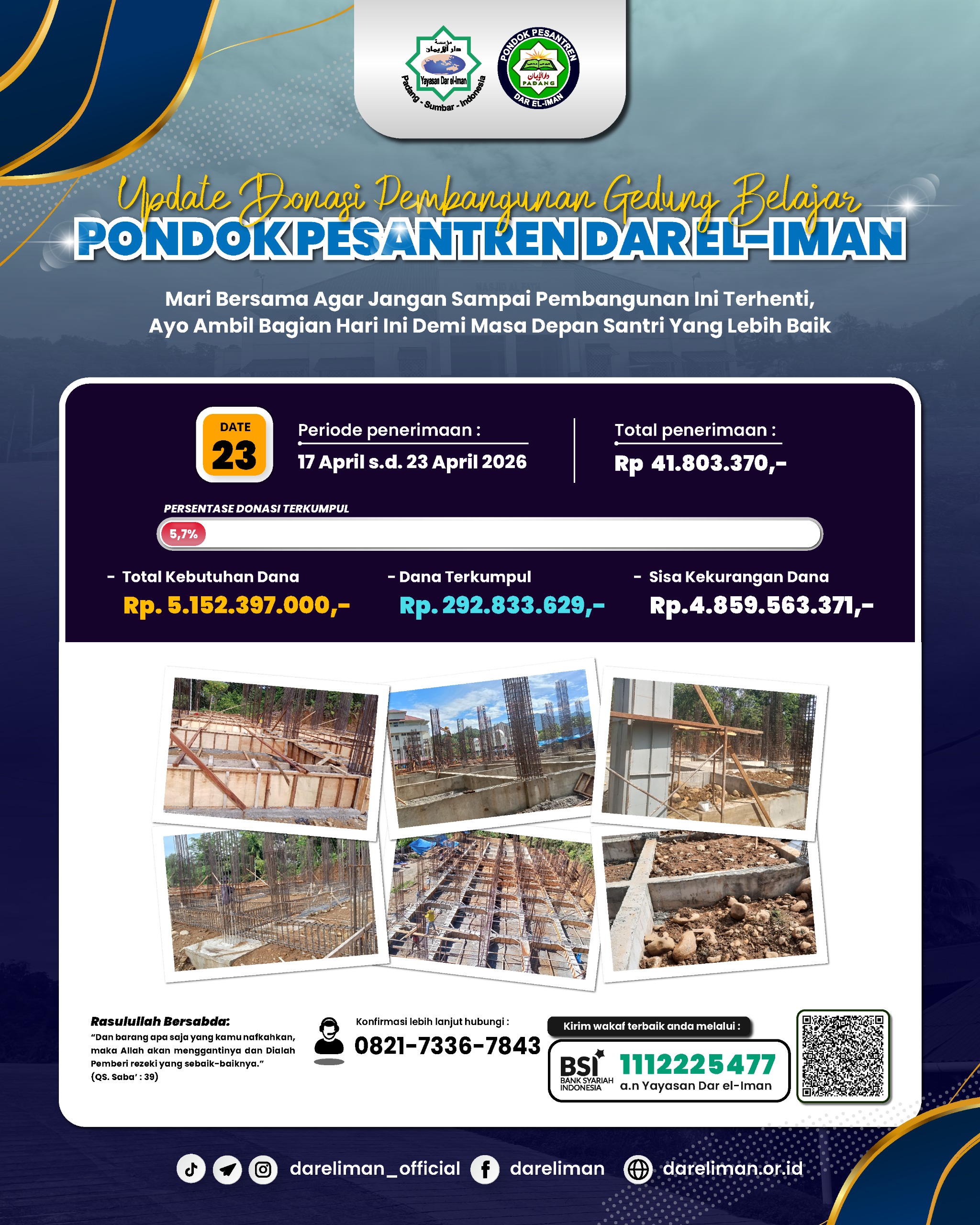 Update Donasi: Pembangunan Gedung Belajar Pondok Pesantren Dar el-Iman – 23 April 2026